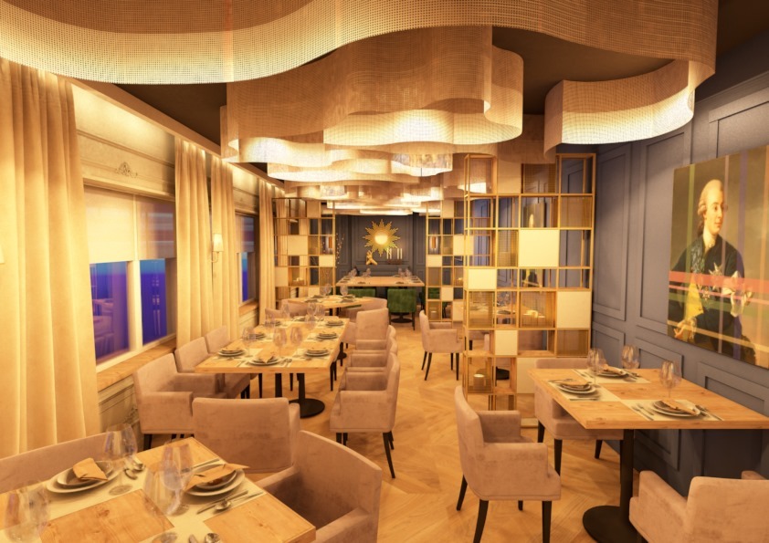 Задачей было создать интерьер зала как для повседневной посадки, так и для возможности проведения банкетов. Так как интерьер зала должен легко и быстро трансформироваться для проведения банкетов, перегородки между столами легко при необходимости можно передвинуть к стенам. Две из них передвигаются по обе стороны от фальшкамина, который находится в конце зала, а третья к шкафу для верхней одежды, расположенному на входе в зал.