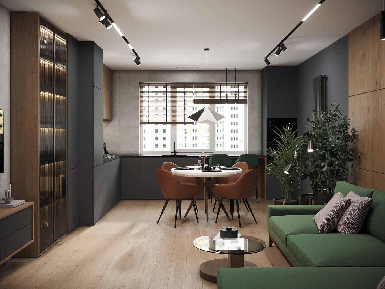 Квартира 101 м кв для семьи с двумя детьми. Кухня-гостиная совмещены, в квартире есть мастер-спальня со своим гардеробом, детская комната, кабинет, два санузла и холл с кладовой-гардеробной. Интерьер выполнен в природных оттенках, теплые оттенки дерева в сочетании с зеленым и серым. Хозяин квартиры работает на дому, обязательным условием был кабинет в квартире с комфортным рабочим местом и стеллажами для коллекции моделей. В детской комнате в стеллаж спрятаны две кровати-трансформеры, что позволяет сохранять всегда порядок в комнате, просторный стол для двоих с хранением. В мастер-спальне за стеклянной перегородкой располагается гардеробная, в зоне лоджии рабочее место для хозяйки квартиры.