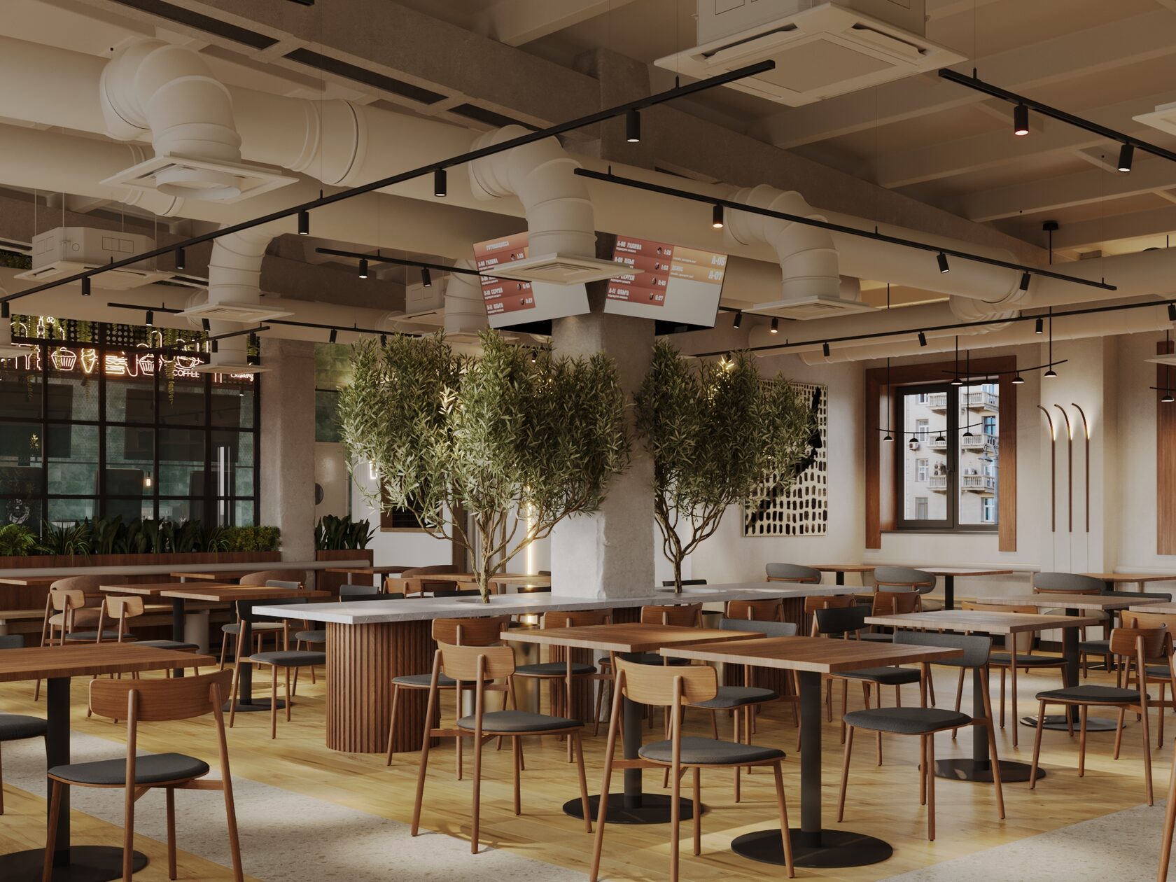 Центральным элементом зала является большой коммунальный стол, в который органично встроены деревья. Это не только удобное место для совместных обедов, но и часть общей концепции зонирования пространства. Над столом установлены экраны, на которых отображается очередь посетителей, что помогает поддерживать порядок и информирует гостей.