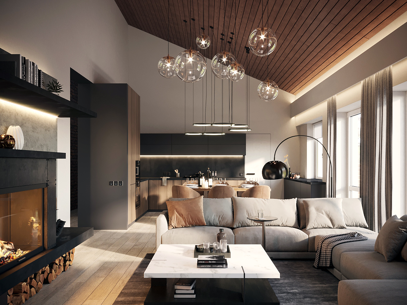 Интерьер выполнен в современном стиле в теплых природных оттенках. Потолок оформлен с помощью доски, этой же доской оформлена часть стены в TV зоне. В гостиной зоне большой угловой уютный диван, камин и зона TV, за этой зоной стена выполнена штукатуркой с имитацией бетона. В обеденной зоне большой стол из деревянного слэба с рекой из эпоксидной смолы. Над столом светодиодный подвесной светильник в виде колец разного диаметра. В интерьере продуманы разные сценарии освещения, подсветка карниза и за коробом в зоне TV. В гостиной зоне светильники подвесные в форме шаров разного диаметра.