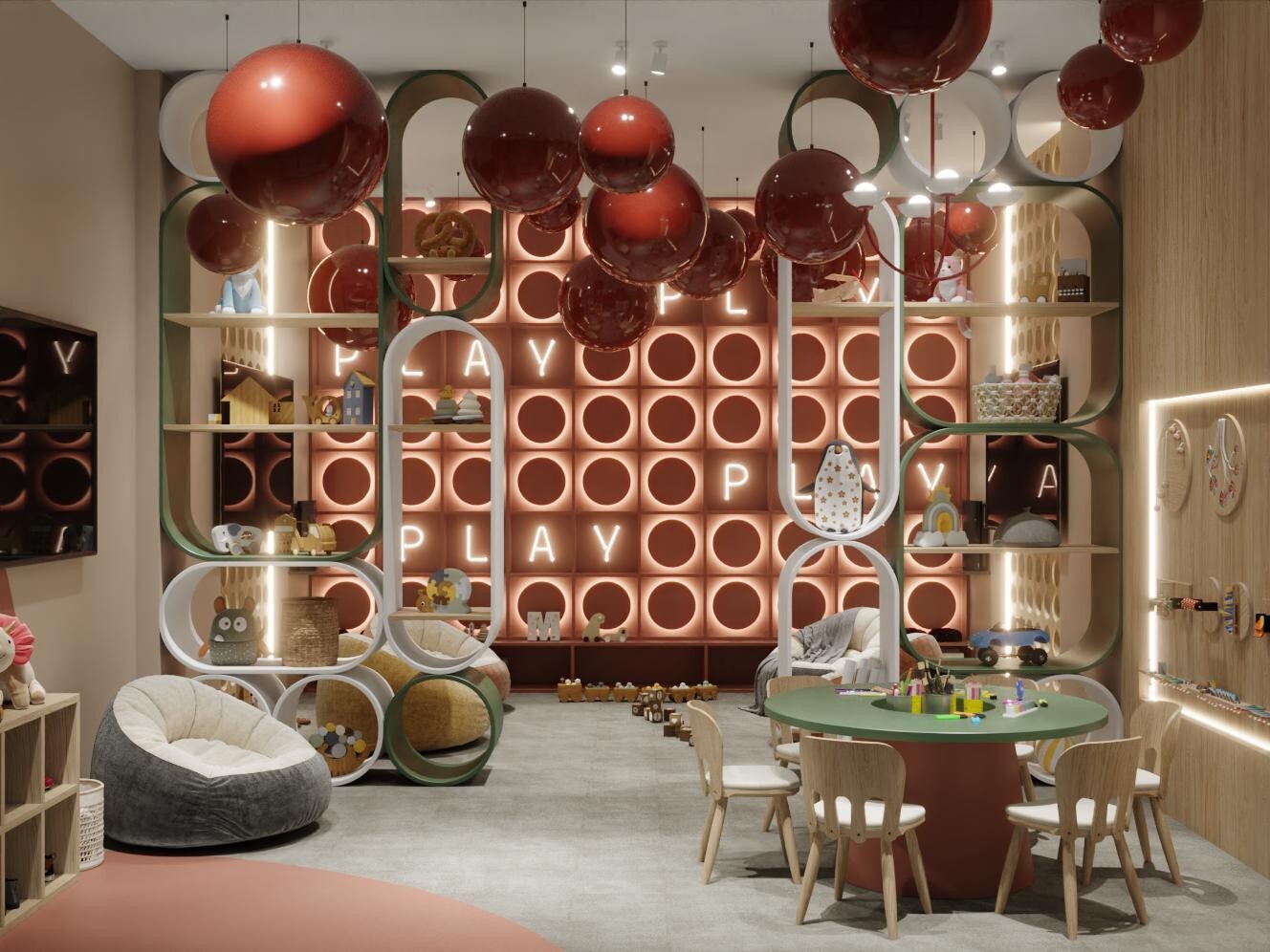 Интерьер детской комнаты ресторана разработан с учетом разных возрастных групп, чтобы создать комфортное пространство, где каждый ребенок сможет найти себе занятие по интересам. Пространство разделено на несколько функциональных зон, что позволяет удобно организовать времяпрепровождение для детей разных возрастов.