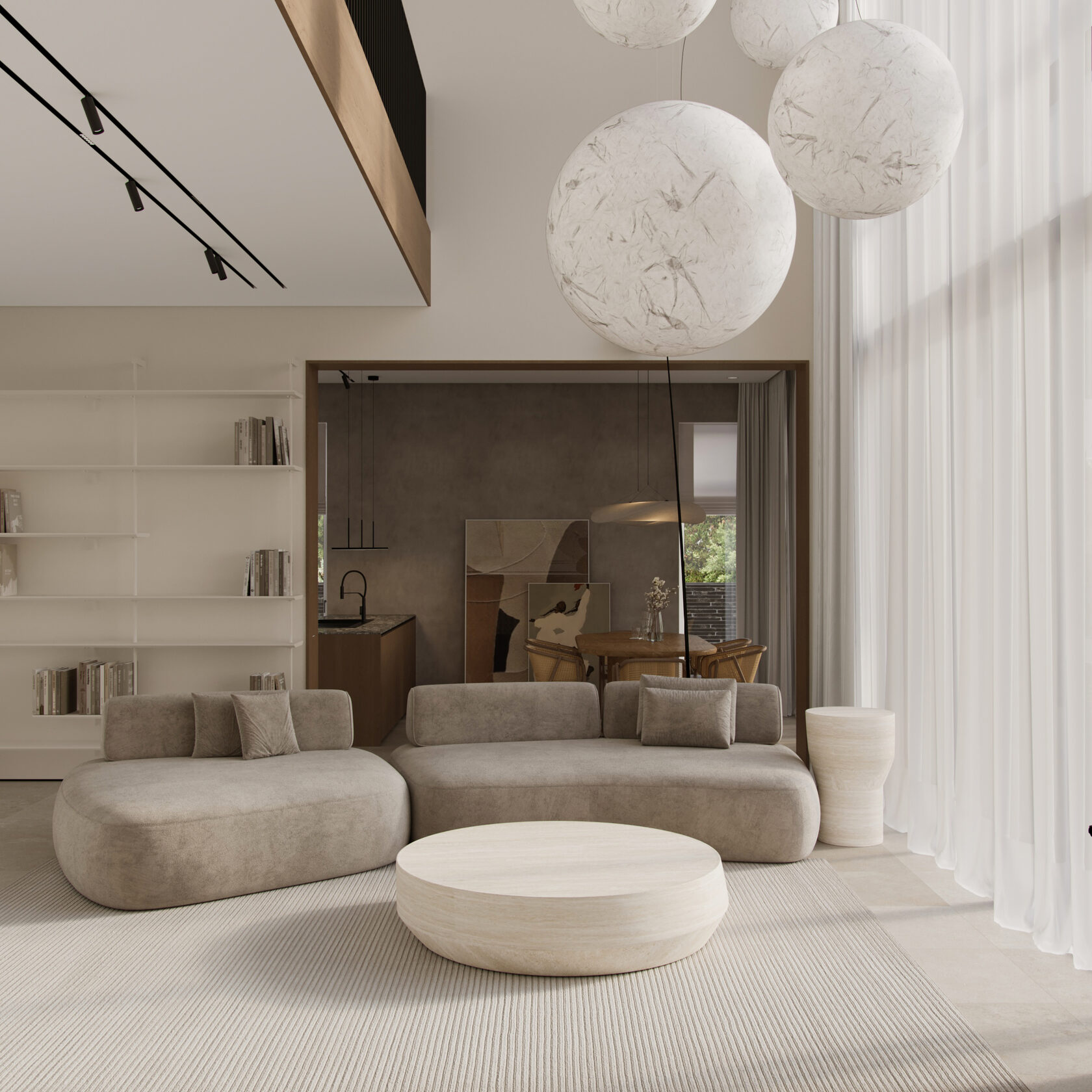 В дизайне интерьера двухэтажного дома доминирует теплая и уютная палитра, основанная на бежевых тонах, искусно сочетающихся с панелями из шпона дерева. Эта гармоничная комбинация создает атмосферу спокойствия и естественной элегантности.