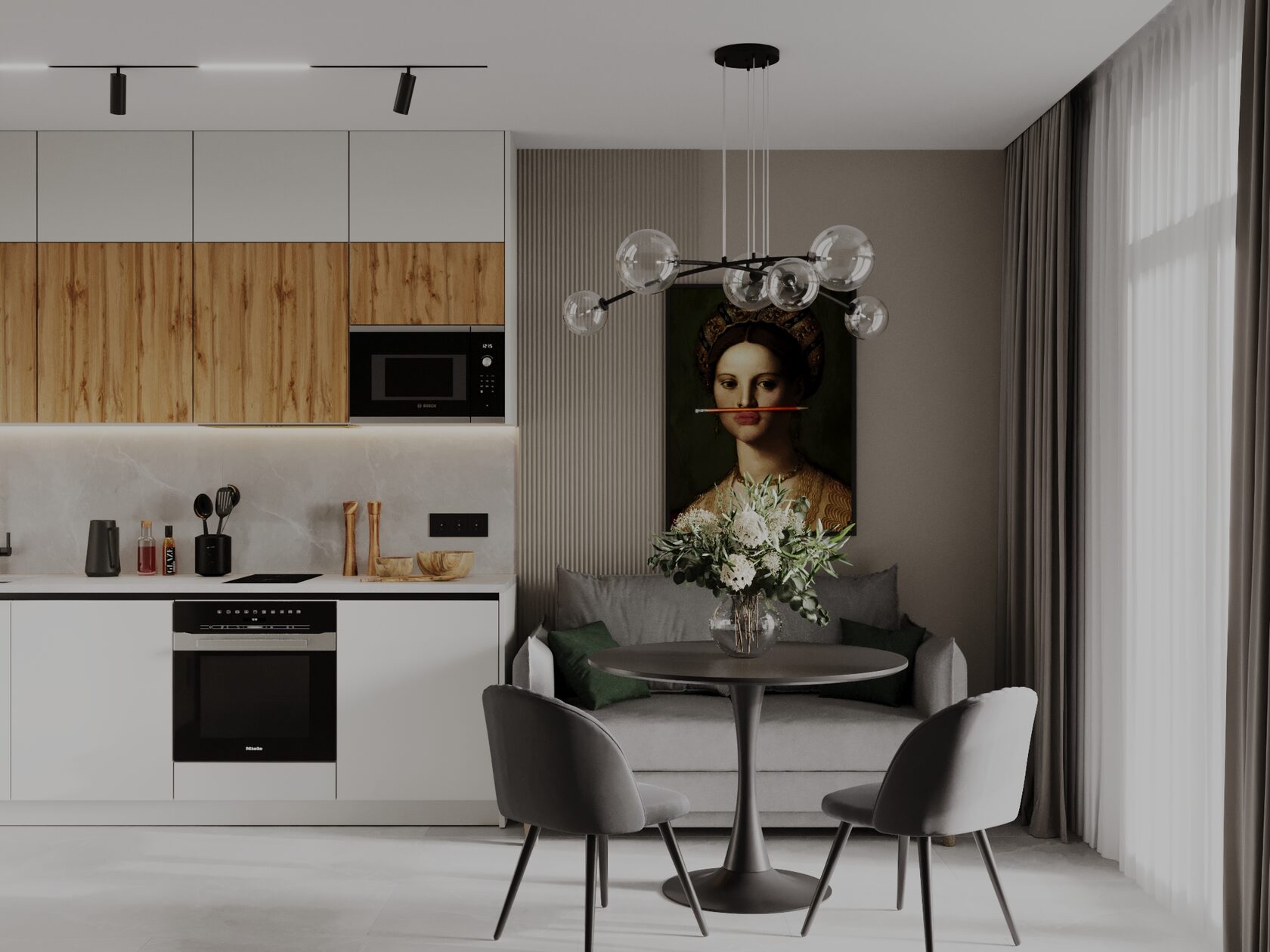 Квартира студия с кухней- гостиной и спальней. Квартира предназначена для сдачи в аренду, в связи с этим она должна быть привлекательной разным темпераментам и возрастам гостей. Квартира выполнена в спокойной серо-бежевой цветовой гамме с зелеными акцентами. В зоне гостиной расположена кухня, зона столовой и зона ТВ. В холле повторяется глубокий зеленый оттенок на стенах. Спальня в спокойных светлых оттенках, зеленые оттенки повторяются только в текстиле, что очень удобно, если через несколько лет захочется заменить этот цвет- это легко будет сделать. Санузел в теплых коричневато- бежевых тонах, с мягкой окутывающей подсветкой.
