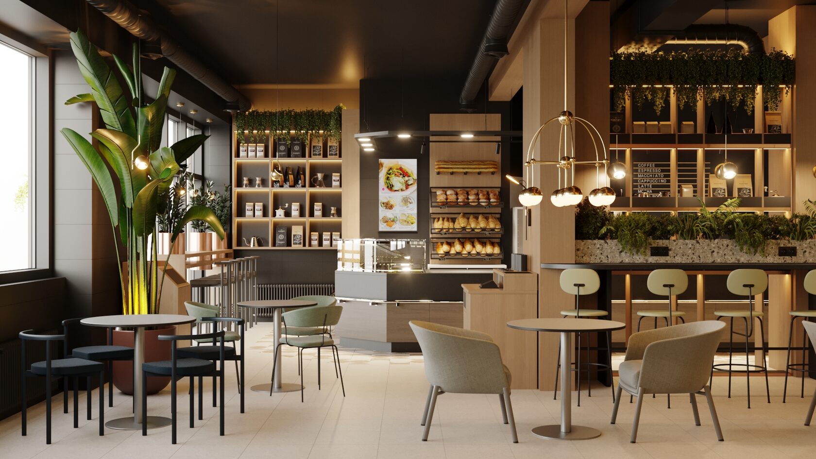 Кофейня находится на улице Гюго. В центре помещения при входе находится большая витрина с с выпечкой и десертами. Свежую выпечку было решено подчеркнуть оттенками тёплого дерева, на полу керамогранит в тёплых оттенках с имитацией терраццо, вокруг витрины геометрическая мозайка, подчеркивающая границы витрины. Потолок тёмный, стены из белого кирпича. В доль расположены диваны оливкового оттенка, над ними зеркала с подсветкой. Есть небольшие столы в центре и барная стойка. Перед окном так же есть стол с барной посадкой с видом на улицу. Разбавляют интерьер высокие растения. Санузел в тёплых бежевых оттенках, зона инсталляции выполнена по эскизу из мозайки керамогранита. За раковиной зеркало в виде арки, расширяющее пространство.