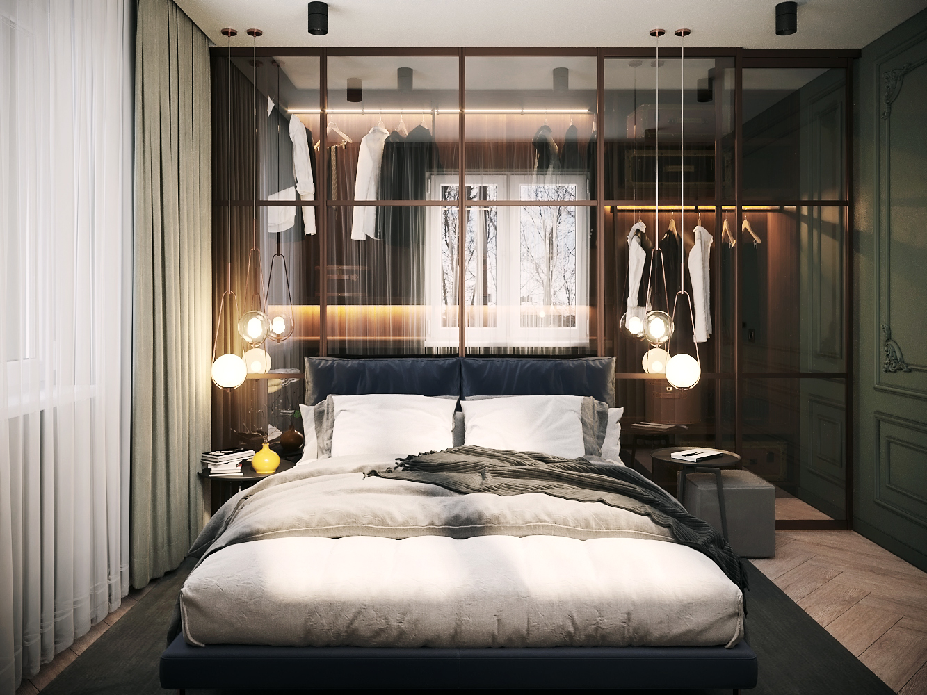 Квартира находится в тихом районе города Калининграда. Дизайн выполнен в современном стиле. Было решено произвести перепланировку в квартире, объединить гостиную с коридором и поменять ее местами со спальней, с помощью этого хода удалось расширить пространство и избавиться от длинного узкого коридора. В спальне с помощью перегородки удалось отделить гардеробную зону от спального места.