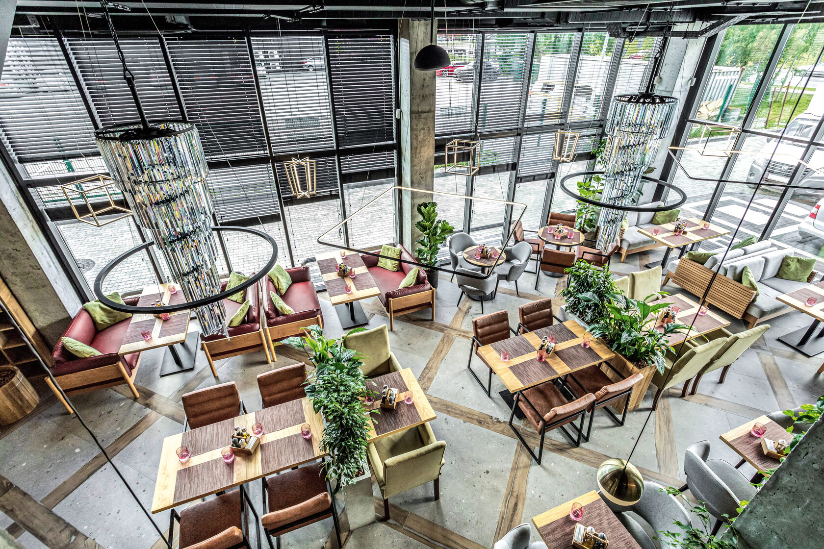 По всему периметру зала первого и второго этажа панорамные окна, на окнах деревянные жалюзи, которые при солнечном освещении дают тени по залу. Посадка везде разная, есть и уютные диваны, изготовленные под заказ, и так же посадка с креслами. Отделка стен выполнена с помощью клинкерного белого кирпича. Столы с деревянными столешницами, придающими помещению уют, Ступени лестницы и зона раздачи так же выполнены из натурального дерева. В зале ресторана и на летней террасе многочисленное озеленение, что так же придает ресторану и уют и уединение для гостей. Освещение ресторана поделено на 2 функции, одна это декоративное освещение, вторая это функциональное галерейное освещение, создающее приглушенную атмосферу.