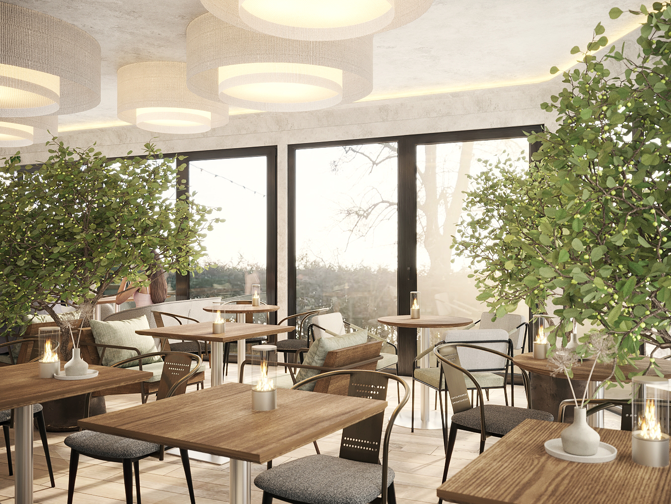 Ресторан находится на Верхнем озере города Калининграда. Ресторан небольшой, всего 60 квадратных метров, но при этом очень уютный. Открытая кухня, открытая зона приготовления напитков привлекает посетителей и производит эффект доверия. Стены и потолок выполнены из декоративной штукатурки, плавно переходящей со стен на потолок, стирая тем самым границы между ними. На потолке светильники из текстиля разной формы, выполненные под заказ. Мебель вся подобрана из элементов дерева и текстиля, придающее теплое ощущение. Санузел выложен керамогранитом, теплого оттенка оливы.
