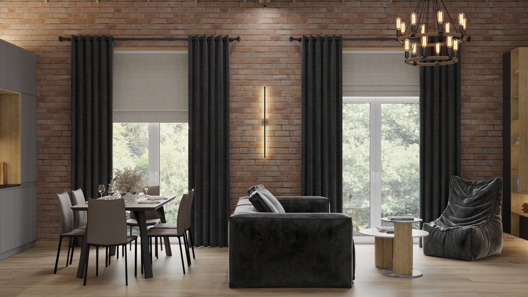 Назначение дома под сдачу в аренду, поэтому главной задачей было практичность, но при этом должно быть уютно. В доме есть кухня-гостиная, две спальни, санузел и холл. Гостиная со вторым светом, что придаёт помещению ощущение простора, в ней располагается диванная зона с ТВ и кухня. В отделке использовался красный кирпич, тёплое дерево и серые оттенки для мебели. Одна спальня родительская с большой кроватью, вторая с двумя отдельными кроватями, которые при желании можно тоже сдвинуть. Санузел с душевой кабиной, в ней находится так же шкаф со стиральной машиной и системой хранения. На полу во всех помещениях керамогранит с имитацией паркета, стены декоративная штукатурка.