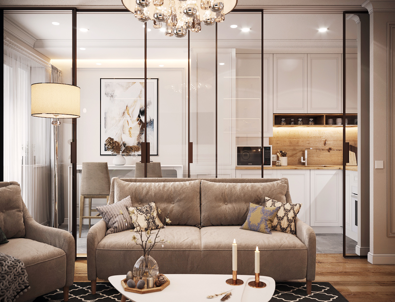 Квартира расположена на берегу моря в городе Зеленоградске. Интерьер выполнен в теплых природных оттенках. Гостиную и кухню разделяет стеклянная перегородка, которую можно убрать в нишу и пространство станет единым целым. В мягкой зоне гостиной расположен биокамин, придающий уют. В стеллаже расположена кровать- трансформер, такой ход дает возможность сохранить больше свободного пространства. Кухня минималистична, у стены полубарный стол со стульями, при желании перемещается в зону за диван. В холле отделили зону гардероба, получилось отдельное помещение для хранения. В санузел на стенах керамогранит терраццо. На лоджии по желанию заказчицы расположили кресло-гамак.