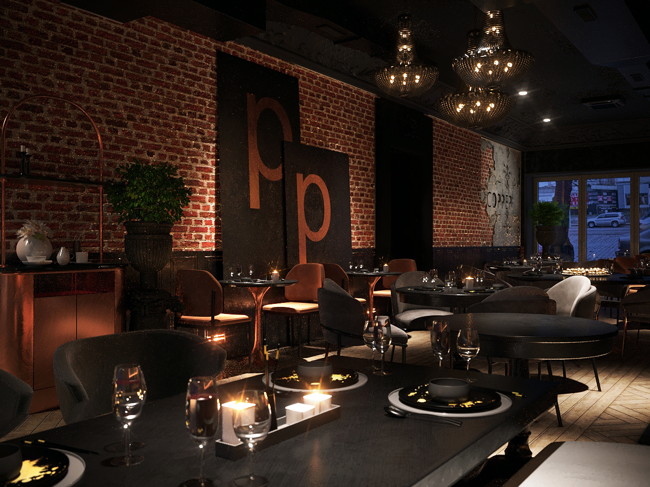 Ресторан находится в кинотеатре "Заря" на проспекте Мира в городе Калининграде. В ресторане два зала, один с барной стойкой и стеллажом с алкогольной продукцией. Отправной точкой проекта стала медь... В интерьере очень много элементов медных, этот металл очень хорошо сочетается со старым немецким кирпичем. В центре помещения располагается каминная зона, люстры ручной работы очень гармонично дополняют его, создавая очень уютную атмосферу. Акцентом в ресторане так же является потолок, массивные потолочные карнизы, элементы дранки и все это выкрашено в глубокий черный цвет. По периметру помещения располагаются панели из металла с подсветкой, умышленно не выкрашены, а оставлены с индивидуальным неповторимым рисунком металла. В интерьере большое внимание уделено освещению, было важно соблюсти интимную, приглушенную атмосферу. В санузлах в общей зоне располагаются умывальники, изготовленные из фибробетона под заказ специально для проекта, ниша из меди для полотенец, теплая мягкая подсветка, установленная в плинтуса. В отделке бара использовалась только натуральная медь, которая со временем будет состариваться, придавая заведению шарм, напротив бара небольшие барные столики для двоих, так же из меди.