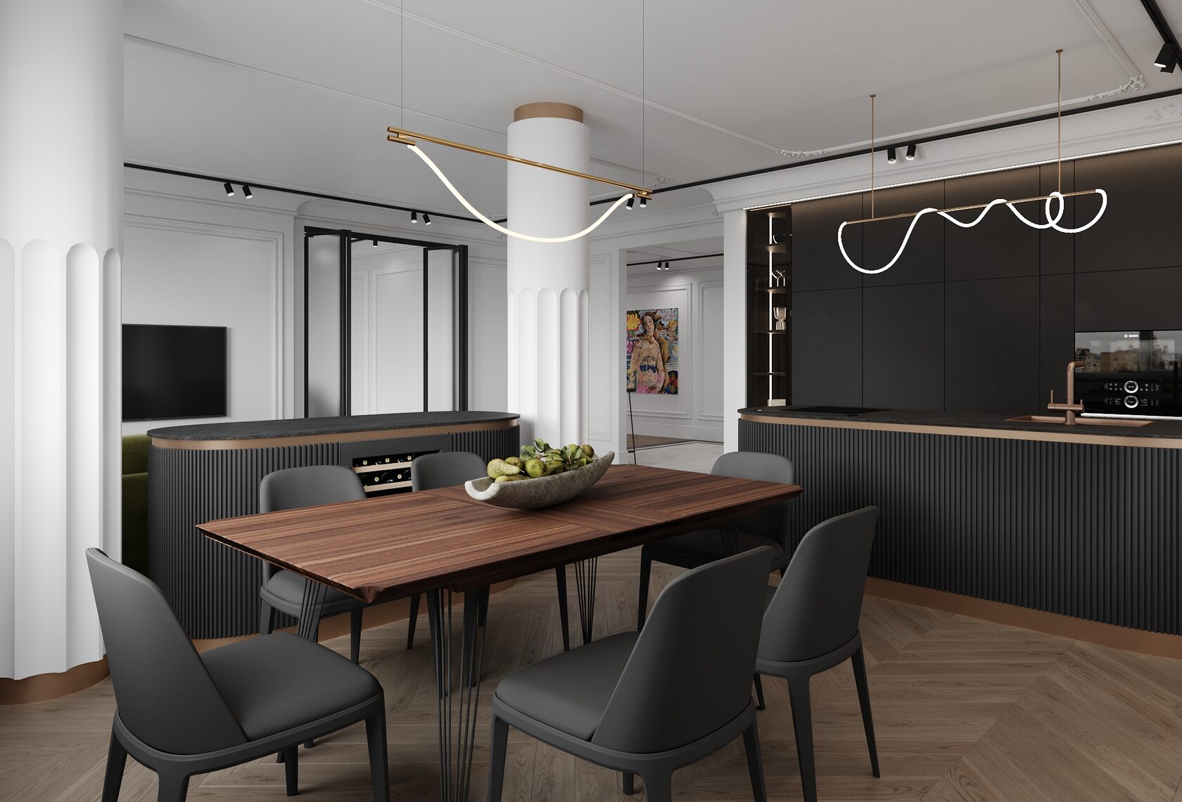 Кухня состоит из пеналов, в которых располагается бытовая техника и хранение и функционального острова с мойкой и варочной поверхностью, в зоне столовой располагается комод, повторяющий остров кухни и большой стол. В кабине располагается раскладной диван и рабочий стол, стеллаж для хранения. Детская комната максимально функциональная, большой рабочий стол у зоны окна, спальное место, спортивный уголок, стеллаж для хранения игрушек и книг. Мастер спальня совмещена с просторной гардеробной комнатой, в спальне есть свой санузел.