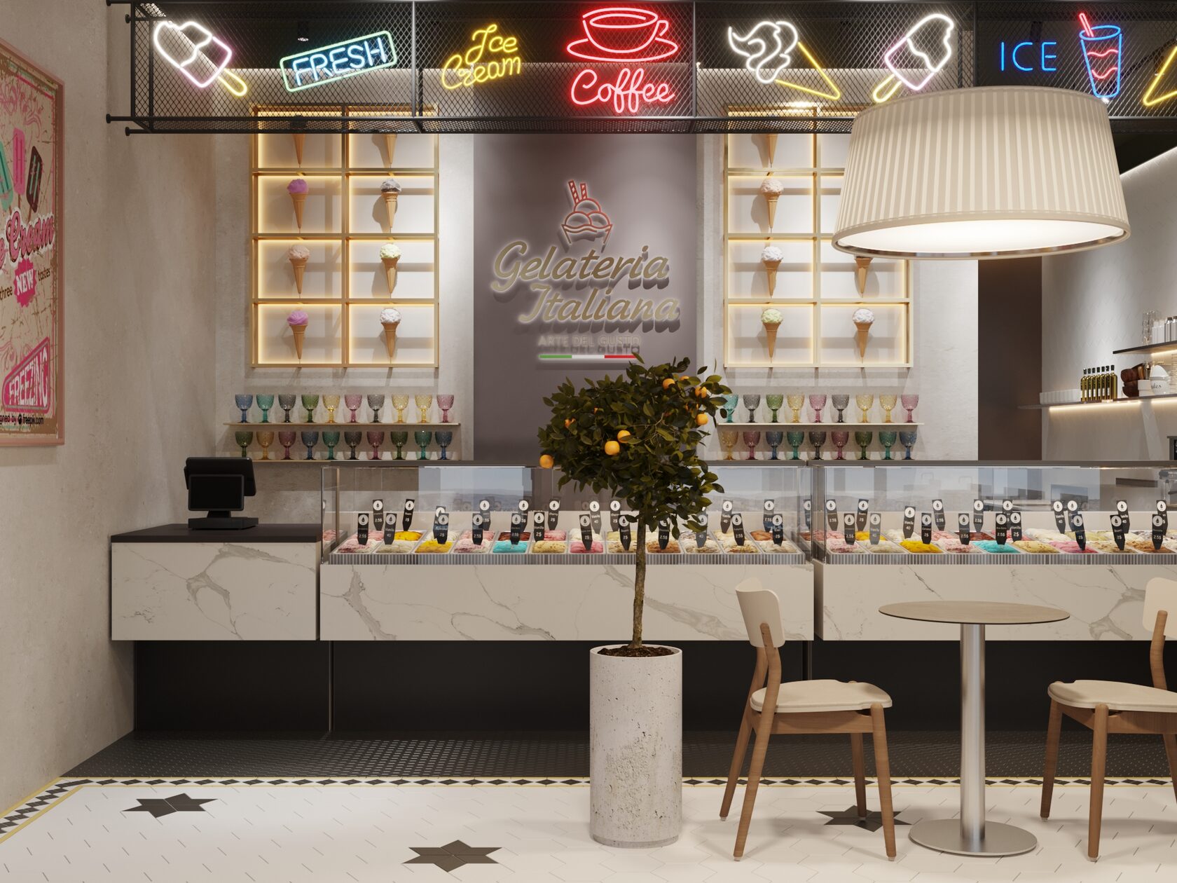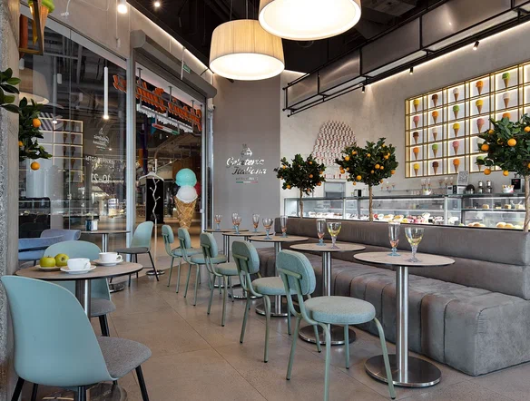 Желатерия находится в торговом центре с выходом на пешеходную улицу города Калининграда. Главным акцентом желатерии является витрина с мороженым собственного производства, которое находится прямо за стеной...