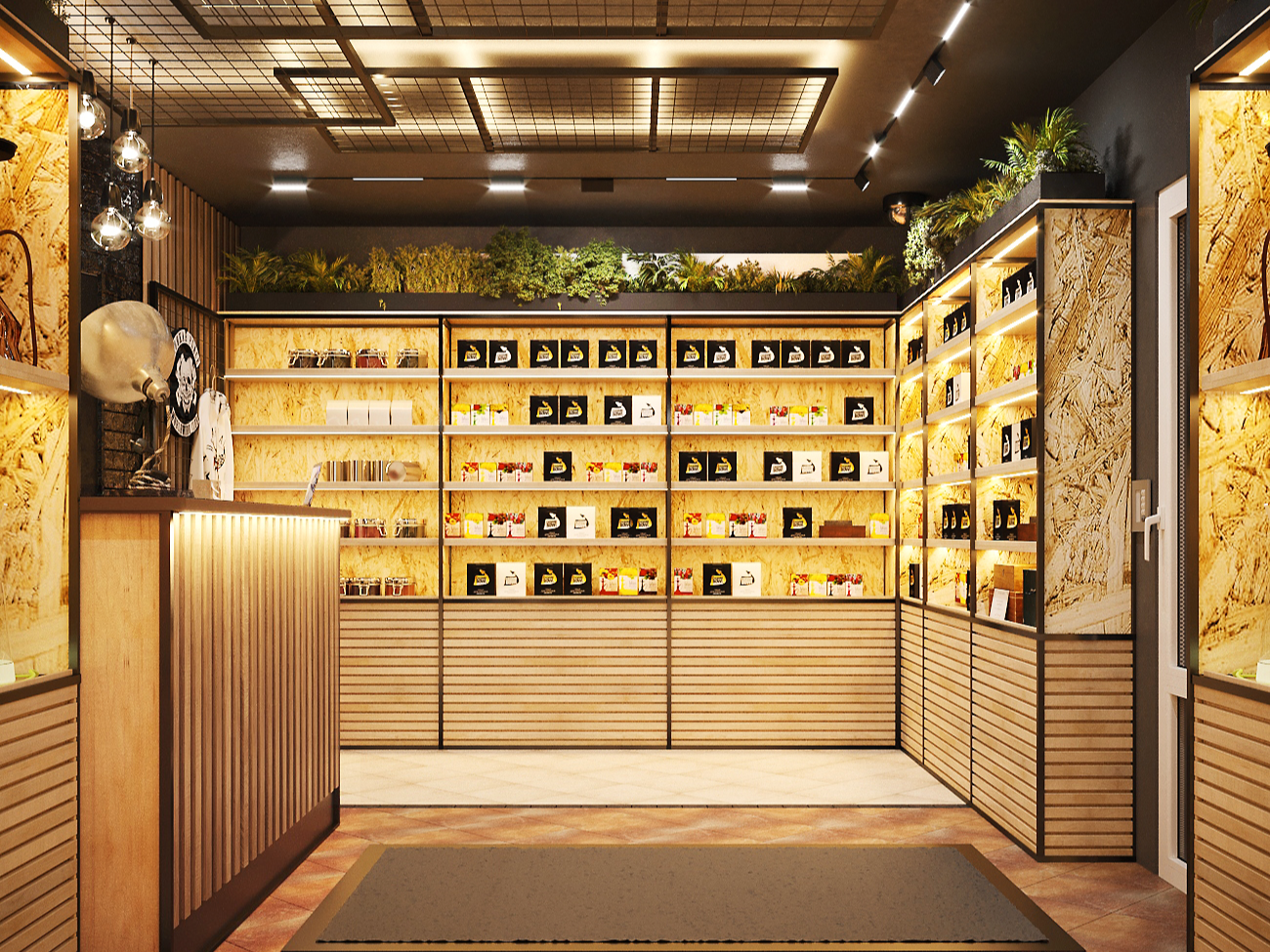 Магазин находится в центре города на улице Черняховского. Интерьер выдержан в одном стиле с другими магазинами сети. Стеллажи выполнены из дерева и металла, на них установлены длинные вазоны с растениями. На потолке акцентные решетки с подсветкой из металла...