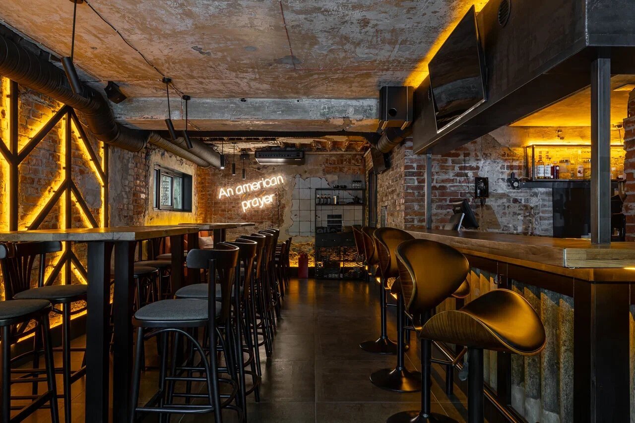 Бар находится не далеко от центра города, в историческом районе города Калининграда в здании дома офицеров. Здание кирпичное, со своей историей, поэтому было решено подчеркнуть существующие кирпичные стены с помощью подсветки и декора. Центром притяжения в заведении является барная стойка, вокруг неё располагается вся остальная посадка. Внешняя часть бара отдела на старым шифером с элементами деревянных балок, верхняя подвесная конструкция из листового горячекатанного металла, покрытая лаком. В помещении есть как и низкая диванная посадка, так и высокие полубарные столы. Все столешницы изготавливались из старой амбарной дубовой доски, двери с эффектом состаривания так же изготавливались под заказ. По периметру помещения высокий плинтус с подсветкой, подчеркивающий тот самый кирпич. Потолки, местами разрушившиеся керамические блоки, отслоившаяся штукатурка, было решено тоже оставить как есть. Санузлы тёмные, с элементами подсветки.